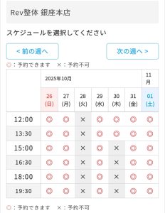 メニュー内の「施術のご予約」から「銀座スケジュール」をタップしてください。◎の受付可能枠からご希望の日時を選んでご予約ください。